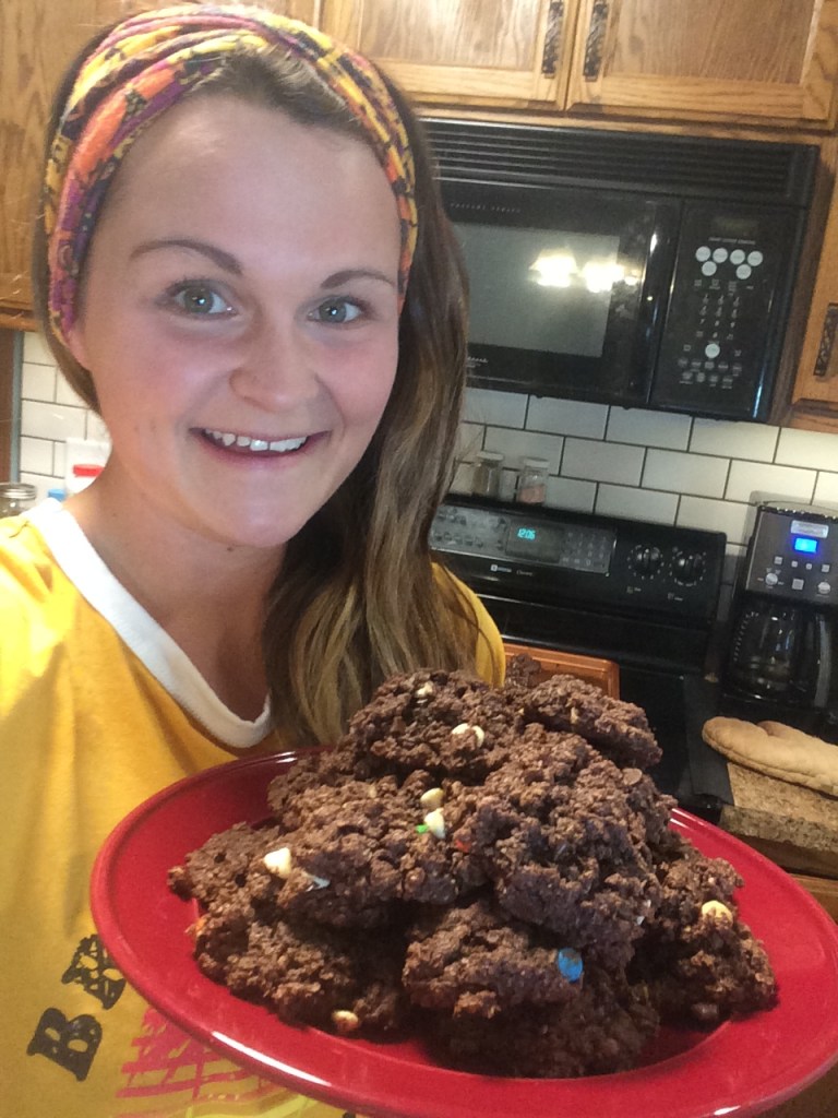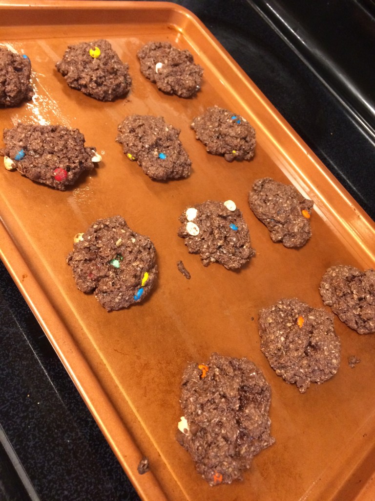 Pre-heat oven to 350°. In large mixing bowl blend butter/coconut oil, peanut butter and sweeteners. Add vanilla and eggs and mix. In separate medium size bowl, combine flours, protein powder/flax meal, oats, cocoa powder, baking soda, and salt. Slowly mix dry ingredients into wet ingredients. Lastly, add the fun stuff! Spoon cookies of desired size onto a greased baking sheet and bake for approx. 8-10 minutes. Let cool for 10 minutes before moving to cooling rack.