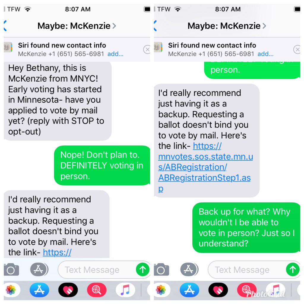 ~Don’t ask why the country was pushed SO HARD to go the route of mail-in ballots. And when I say pushed, I mean pushed. I’m not making this up… here’s a screen shot of a text I received just TWO WEEKS before Election Day: