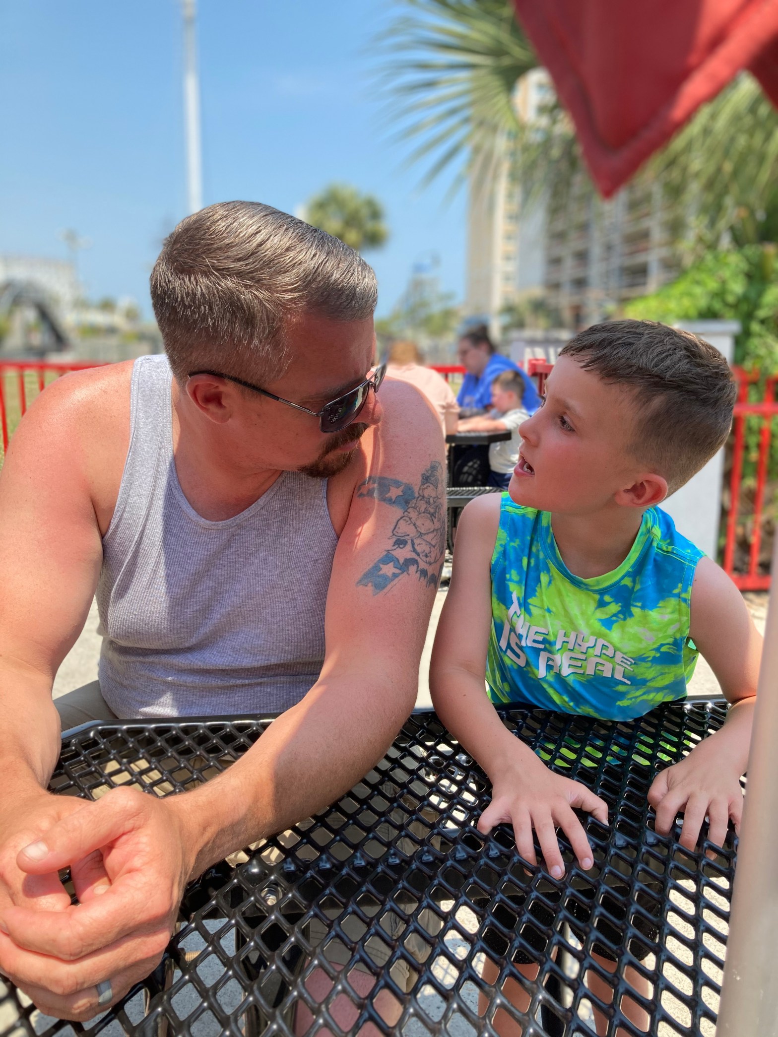 Quite out of the blue, my uber friendly (but very unmasked) Eli walks over, squeezes between the father/son duo, turns to the little boy, and standing only about an inch away, breathes a very long “Hiiiiii!” directly into that poor child’s face.