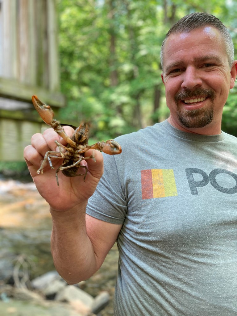 Anywho, last week Derek and Ryan were on the hunt again. Derek was across the creek and every time he’d find a crawdad, he’d pick it up to show me. Now, many of you probably don’t know that my eyesight isn’t great and I refuse to wear glasses unless I’m driving or watching TV. This being the case, any previous crawdads Derek had picked up were too small for me to make out from that distance, so I kept waving him away for my inability to see anything. Until I turned to look that last time and to my surprise I could clearly see the grandaddy of all crawdads my husband was proudly holding up. Maybe I’m not very experienced in crawdad culture but this was the biggest one I’ve seen yet. In fact, shooting straight with you, this was no crawdad, this was a mini-lobster.