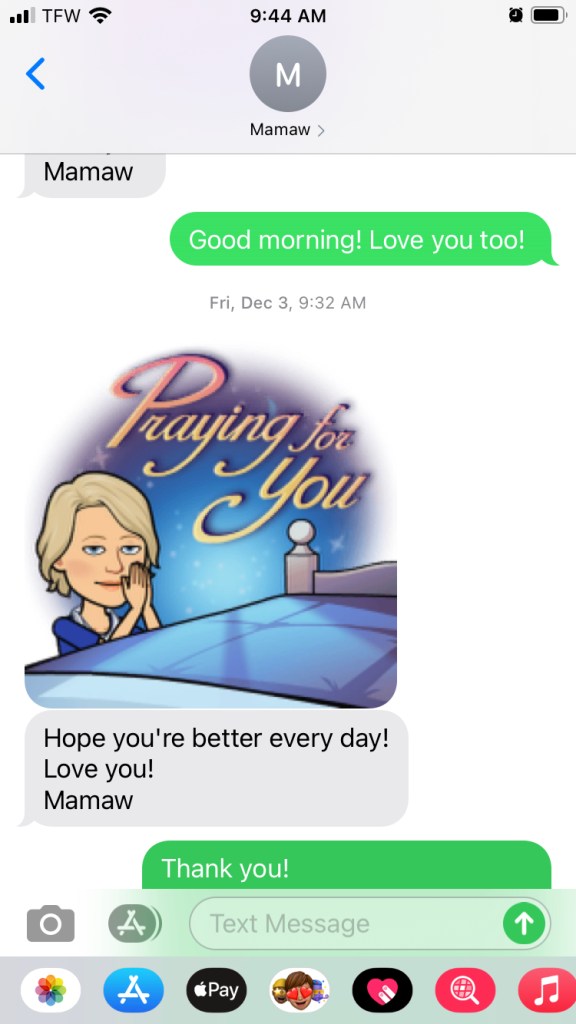 No matter what the crisis or need, if Mamaw knows about it, she’s praying for it. And even when all is well, I’ll receive random messages from her, letting me know she’s praying and interceding for me and it’s such a blessing. Whether I’m sick or well, up or down, I know she’s praying.